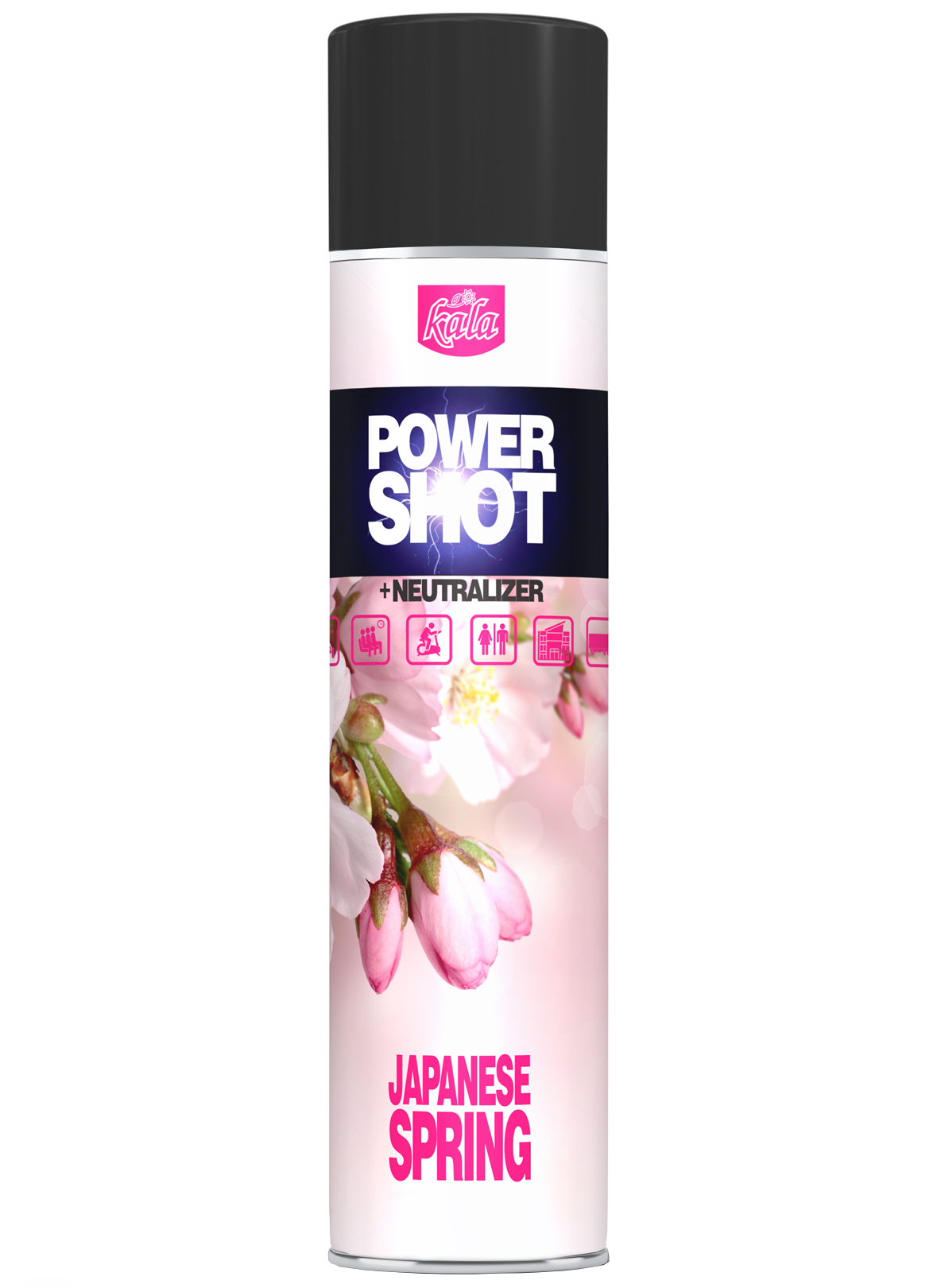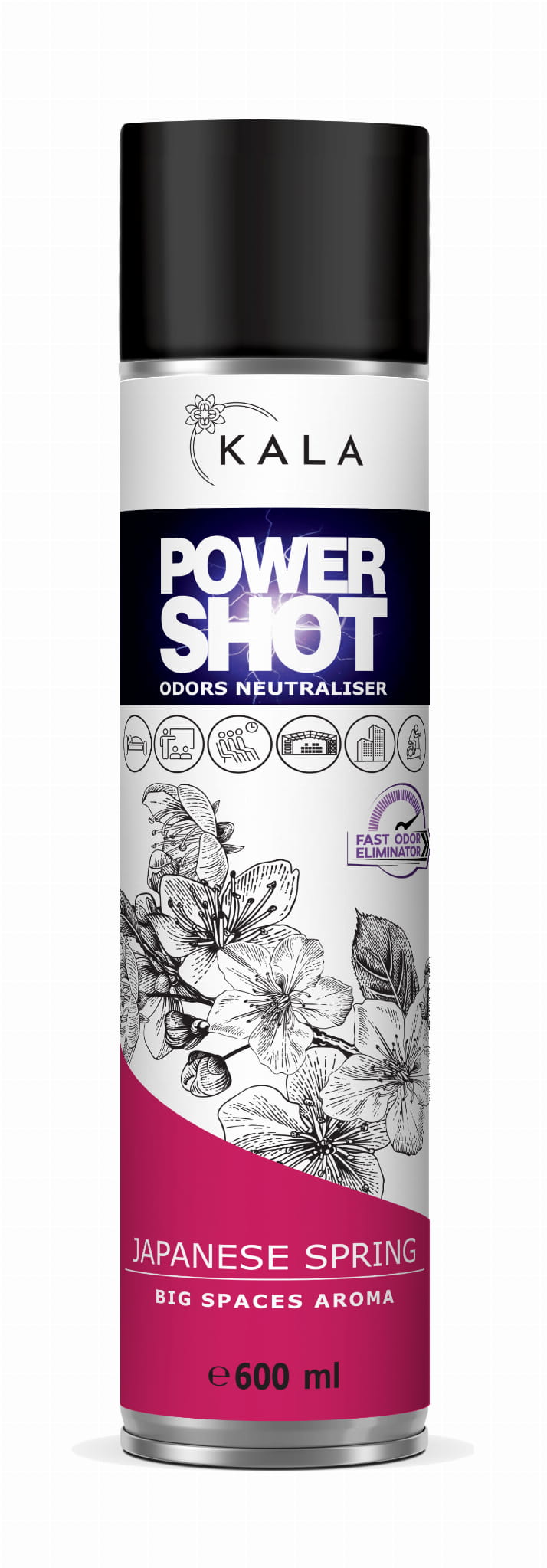 Neutralizator nieprzyjemnych zapachów, aromatyzer, odświeżacz Kala POWER SHOT zapach JAPANESE SPRING (600 ml) to zniewalający, zapach kwitnącej wiśni połączony z nutą budzących się do życia drzew oraz rozkwitających wiosennych kwiatów, pobudzi zmysły i doda wiosennej życiowej energii.