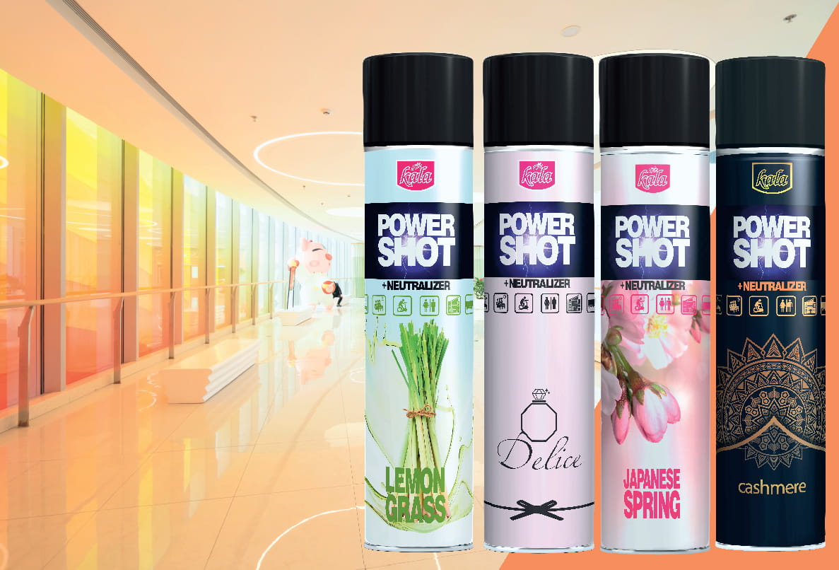 Wraz z neutralizacją nieprzyjemnych zapachów POWER SHOT zapewnia również aromatyzację przestrzeni jednym z dostępnych w gamie POWER SHOT zapachów.