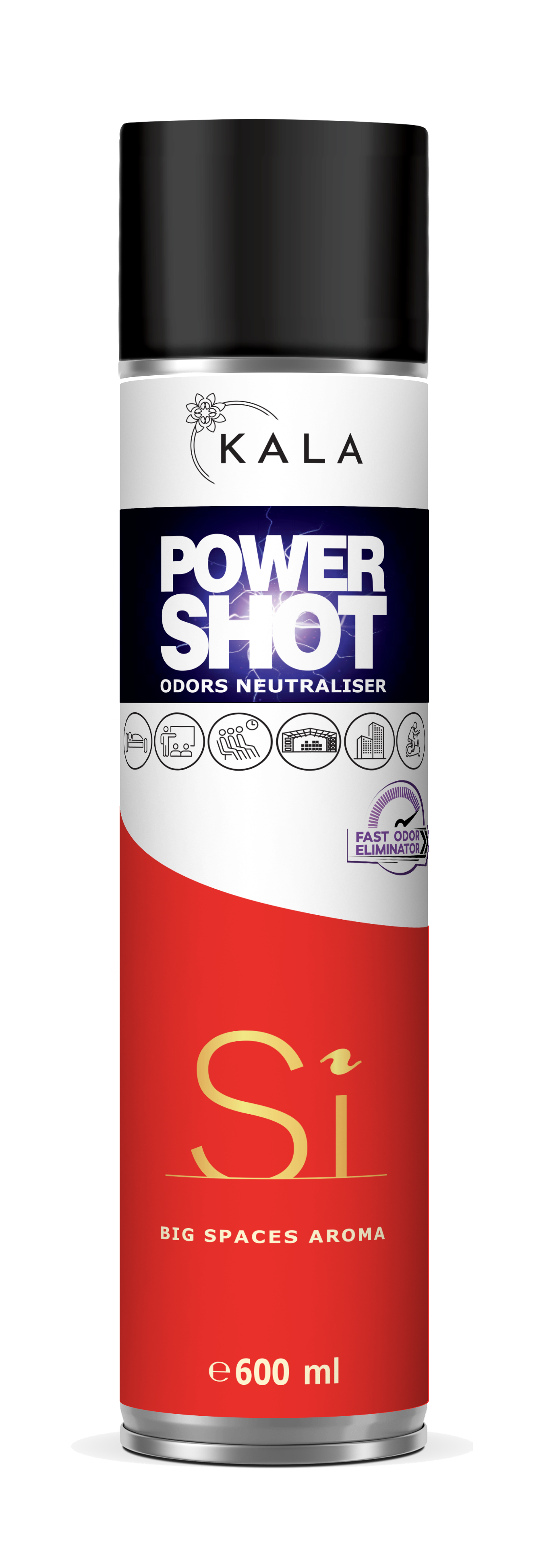 Neutralizator nieprzyjemnych zapachów, aromatyzer odświeżacz Kala POWER SHOT 600 ml to produkt z rewolucyjnym sposobem dozowania, dzięki któremu jedno naciśnięcie wentyla (ok. 1 sekunda) neutralizuje nieprzyjemne zapachy oraz aromatyzuje około 200 m3.